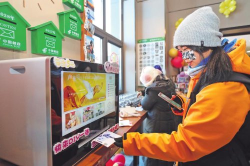前來滑雪的游客在雪都郵局現場體驗打印個人專屬有聲明信片服務。□滕俊 攝