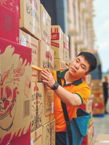 柳州市郵政分公司攬投員正在清點將要郵寄的螺螄粉郵件。 □中國郵政報記者 呂文禮 攝