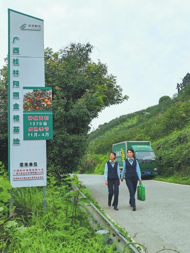 陽朔縣郵政分公司員工來到白沙鎮古板水果專業合作社,上門了解金桔生長情況。 □中國郵政報記者 呂文禮 攝
