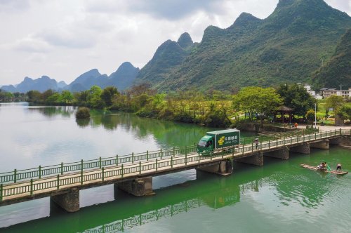 郵車行駛在桂林市陽朔縣遇龍河的大橋上。□周華 攝