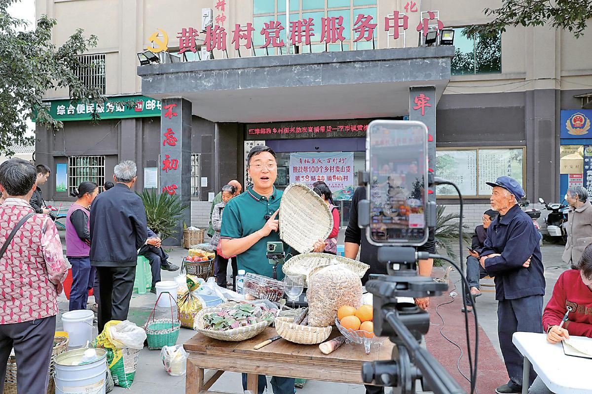 3月27日,重慶市江津區李市鎮黃桷村,一場“青耘重慶·百村行——挑戰幫100個鄉村賣山貨”直播助農活動正火熱進行。郵政青年主播“旺仔”在鏡頭前忙個不停,與網友熱情互動。一旁,黃桷村綜合便民服務站“郵掌柜”葉元學和郵政工作人員一道組織村民有序上場,展示自家的特色農品。