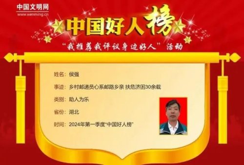 其中,鄖陽區(qū)郵政局南化塘支局投遞員侯強(qiáng)當(dāng)選“助人為樂”類中國好人,一起來了解他的先進(jìn)事跡。