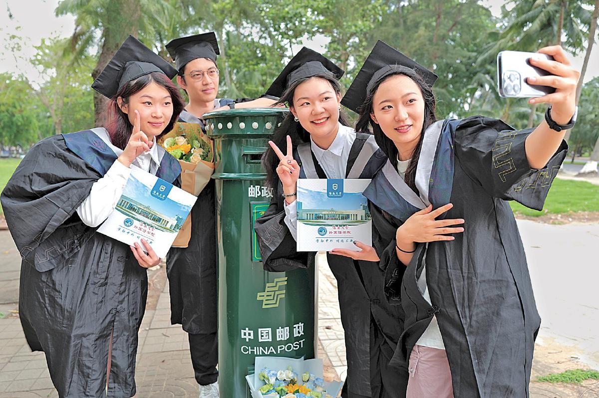 5月21日,海南大學外國語學院2024屆畢業生拿著《畢業紀念冊》在郵筒前打卡拍照,留下一份獨特的美好記憶。