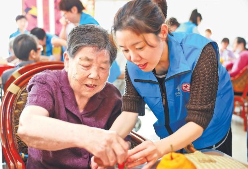 隨后,服務隊隊員為老人們送上水果和蒲扇,并共同穿針引線制作香囊,完成一份很有紀念意義的手工藝品。在服務隊隊員的陪伴下,老人們度過了一段難忘的時光,而他們的笑容和感激的話語,也成了隊員們最好的收獲。