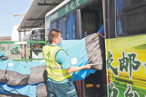 亳州郵政工作人員正在把郵件裝上交郵合作公交車。