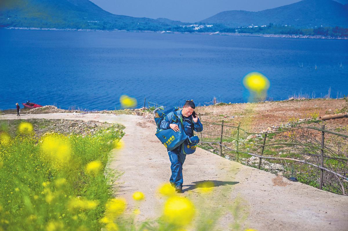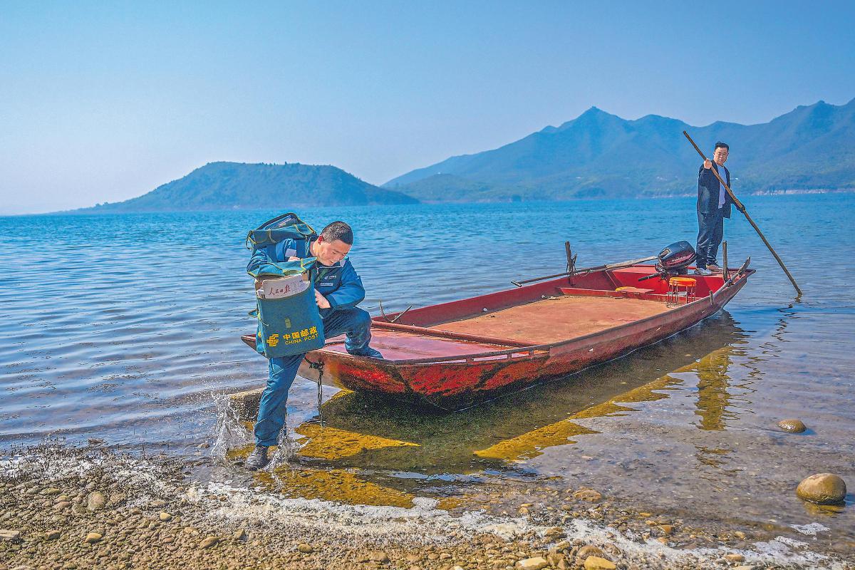 綠色摩托車、綠色郵包、絳紅色渡船、碧波蕩漾的水面和遠處如黛的群山,石新國穿行其間,如同置身一幅青山綠水的秀美畫卷。“這條郵路我已經(jīng)走了20多年,只要鄉(xiāng)親們需要,我會一直走下去。”石新國堅定地說。