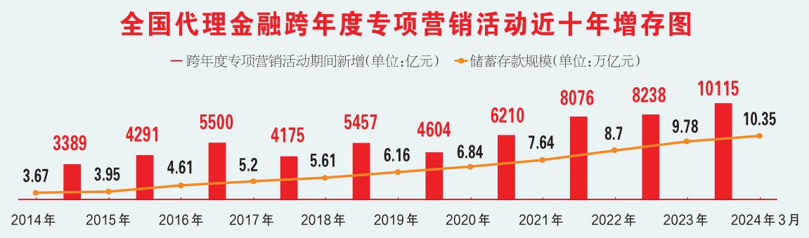 目前,全國郵政代理金融(2023—2024)跨年度專項營銷活動已圓滿結束,各級機構內外兼修強服務、客戶至上增價值、拓客增存增收,取得了顯著成效。活動期間,儲蓄存款新增10115億元,其中,價值存款新增10254億元,價值存款新增占比為101.4%;代發單位新增25448戶,代發金額達4072億元。截至2024年3月末,全國郵政代理金融儲蓄存款規模達103529億元。跨年度專項營銷活動成為全國郵政代理金融儲蓄存款高位爬坡的“主引擎”,近10次跨年度專項營銷活動累計新增儲蓄存款59234億元,今年2月,儲蓄存款規模邁上10萬億元歷史性新臺階。