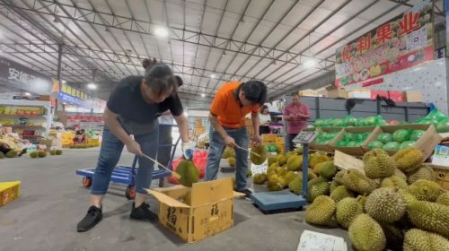 采訪完徐鈺鋒,記者跟隨潘新杰來到離郵政倉(cāng)不遠(yuǎn)的水果市場(chǎng),為當(dāng)日線上訂單客戶挑選榴蓮?!傲裆徱ㄟ^敲打來分辨生熟程度。偏生,就適合發(fā)較遠(yuǎn)的地區(qū);偏熟,則適合發(fā)往近的地方,這樣可以保證客戶收到水果時(shí)生熟正好。如果天氣熱,還要加冰來保證果肉新鮮。芒果如果是發(fā)到東北,我們會(huì)加裝保溫袋來避免水果凍傷?!闭f起不同水果的“發(fā)運(yùn)經(jīng)”,潘新杰滔滔不絕。