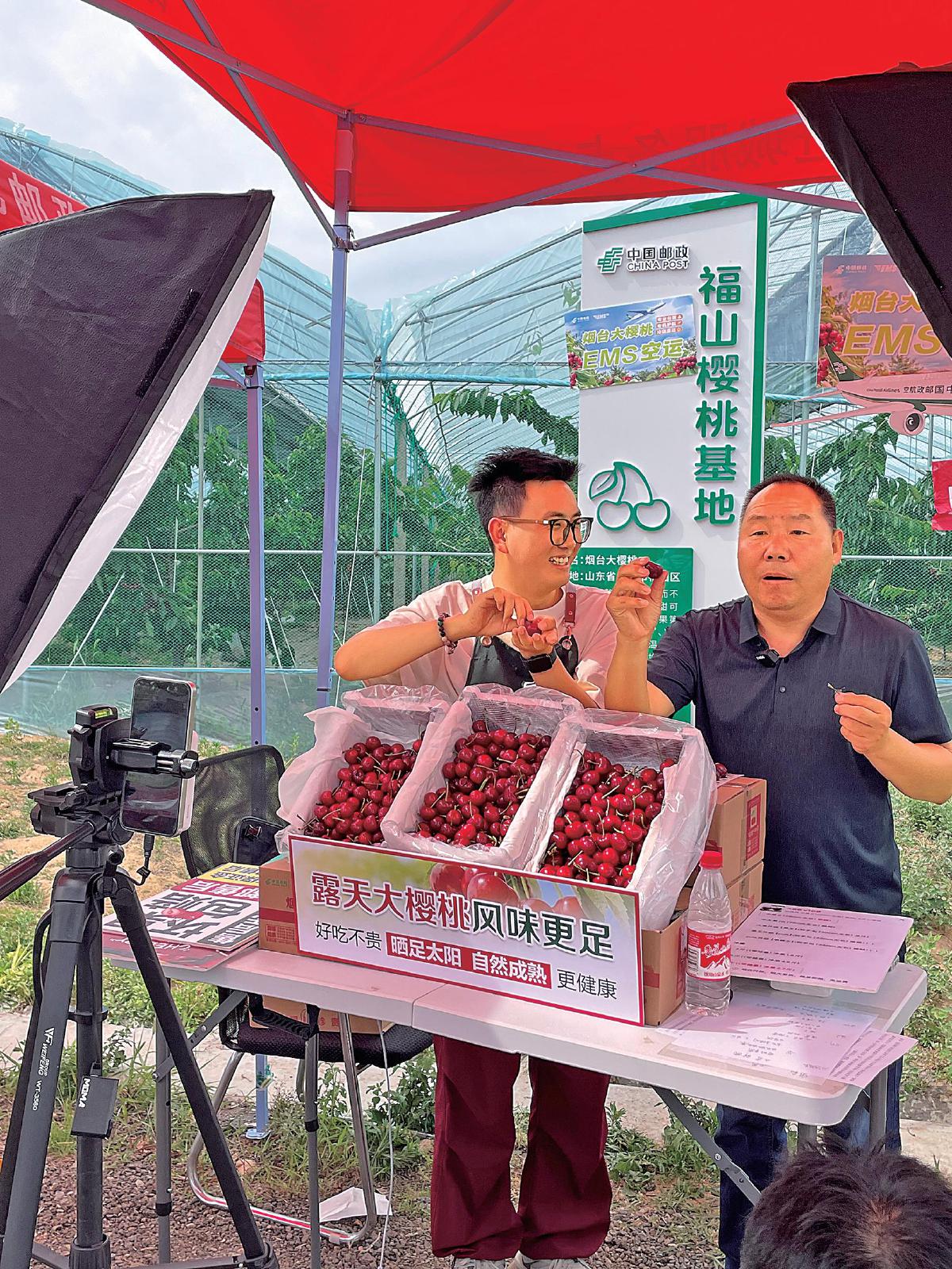 郵政員工與當地合作社負責人在大櫻桃基地進行現場直播。 □李雯婭 攝