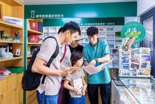 6月18日,來自福建的游客在呼和浩特市玉泉區(qū)塞上老街旅游休閑街區(qū)“塞上主題郵局”內參觀、選購。