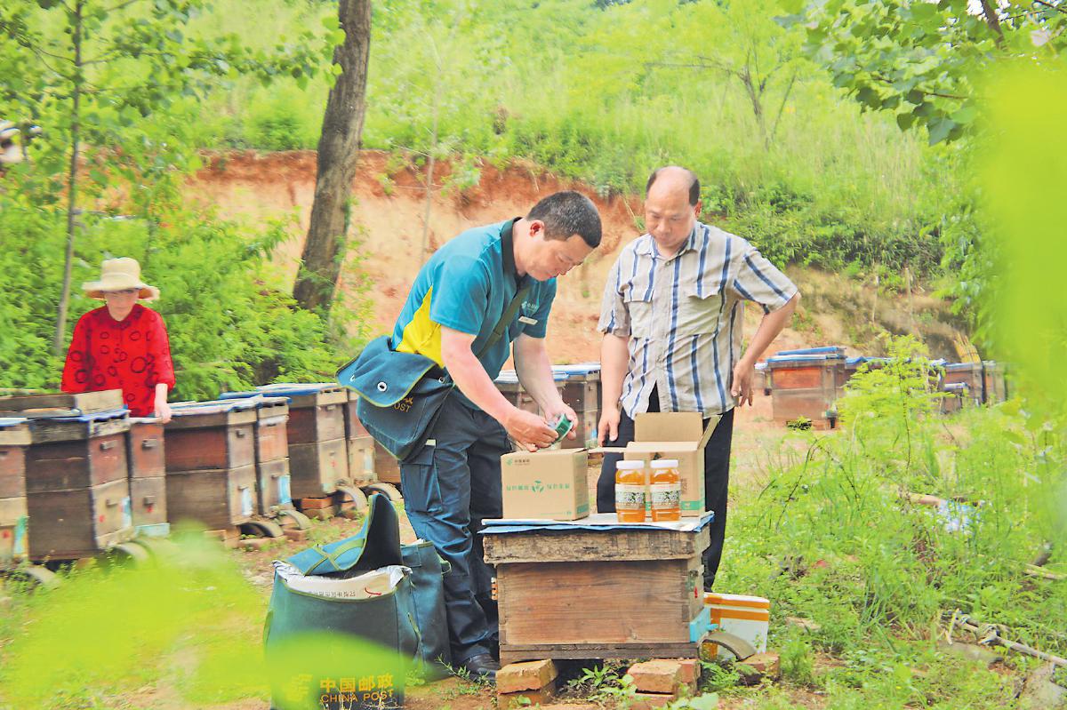 郵政工作人員每天上門收寄蜂蜜,并提供綠色包裝箱,直接從寇軍紅家里寄往全國各地。品牌打響了,蜂蜜走出大山的銷路也暢通了,寇軍紅的蜂蜜從名不見經傳到遠近聞名,成了明星產品,市場銷售供不應求。