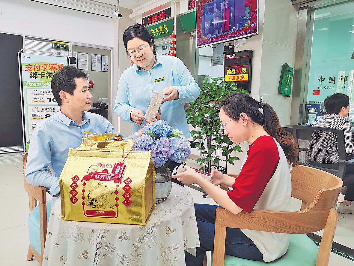 郵政工作人員在網點向客戶推介“狀元米”祈福禮盒。□陳銳 攝