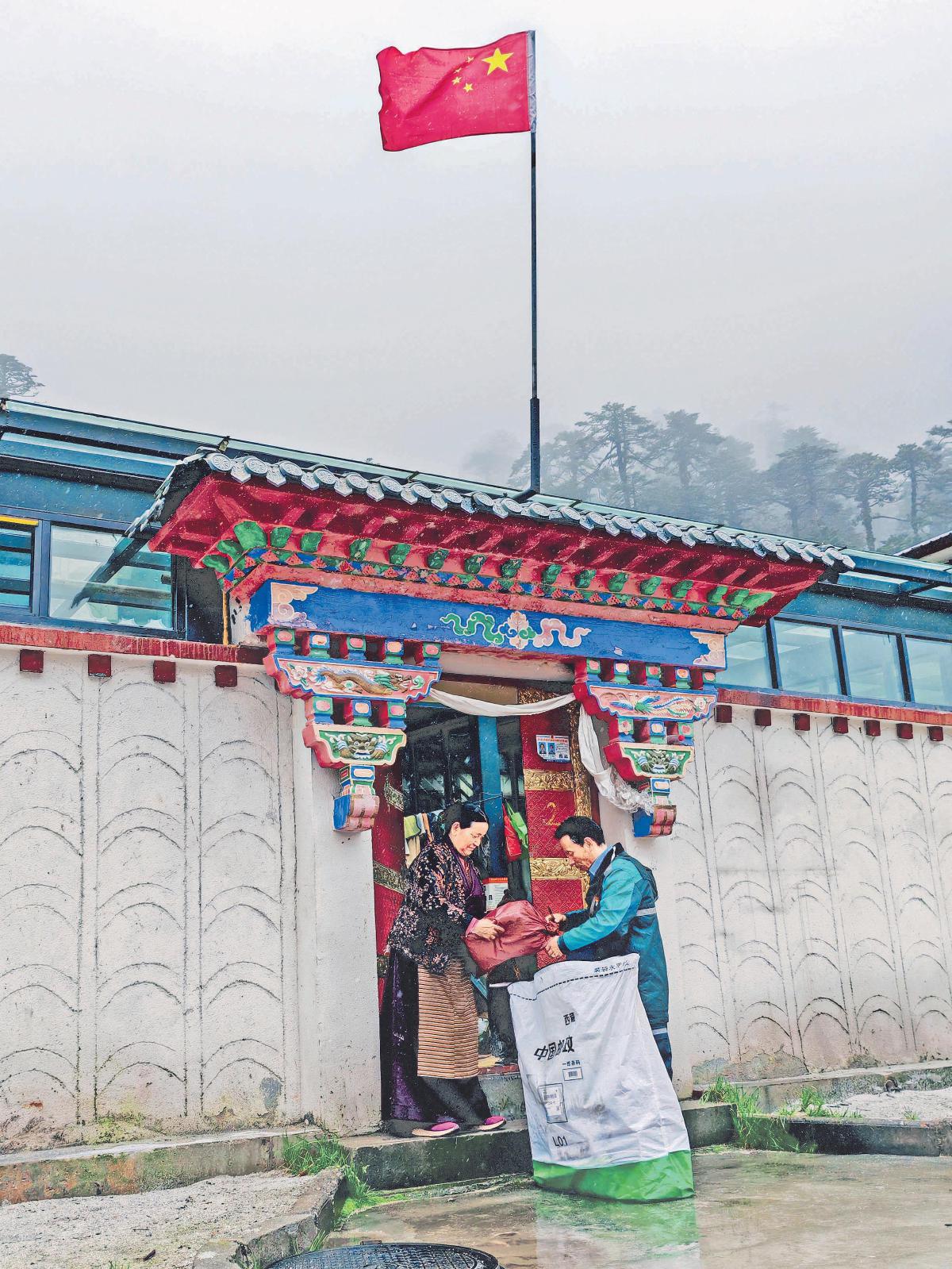 羅布多吉將郵件投遞到邊境村村民手中。