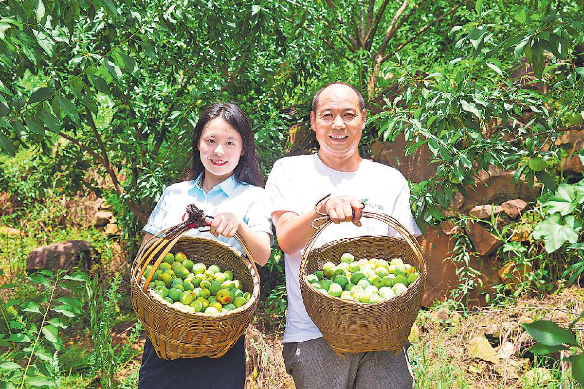 郵政員工與種植戶一起采摘脆李,共享豐收喜悅。