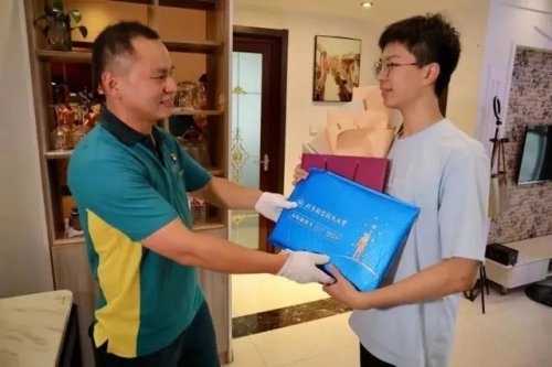 7月10日下午1點,2024年江蘇全省首封高考錄取通知書花落常州。中國郵政常州市分公司天寧攬投部投遞員、“常州市五一勞動獎?wù)隆鲍@得者徐大磊冒雨僅用20分鐘,將北京航空航天大學(xué)的錄取通知書送達考生賈沐洋手中,并向他表示祝賀。