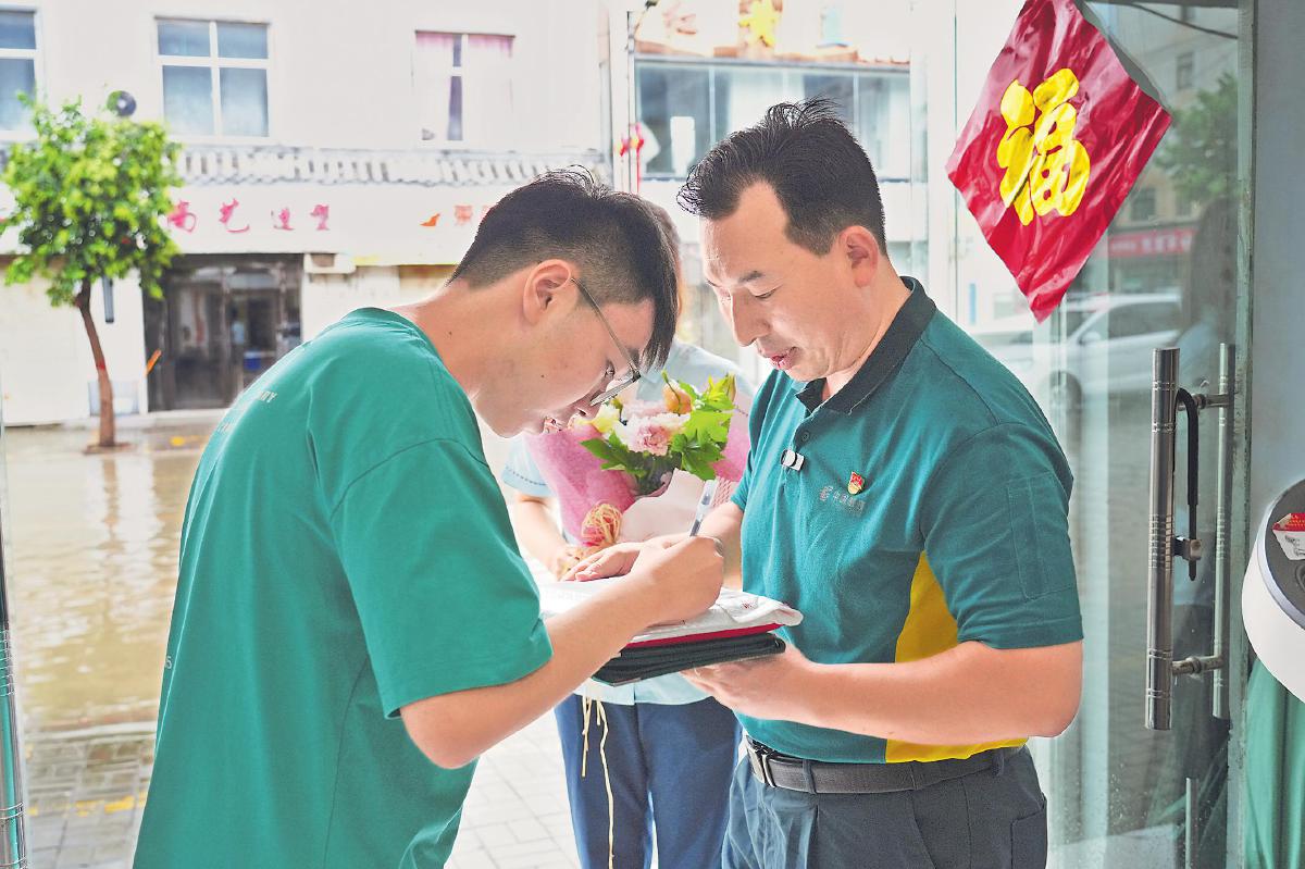 “您好!請問是楊同學嗎?您的北京大學錄取通知書到了……”日前,河南省商丘市郵政分公司攬投員喬金濤冒著暴雨將錄取通知書送到家住周集鎮周集村的考生楊同學的手中,這也是商丘市首封北京大學錄取通知書。7月15日以來,商丘市連降暴雨,部分路段積水嚴重。為確保錄取通知書能夠第一時間送到考生手中,商丘市郵政分公司采用專人專投方式,冒雨投遞。在實際投遞過程中及時調整投遞路線,盡可能減少因暴雨而增加的投遞時間。