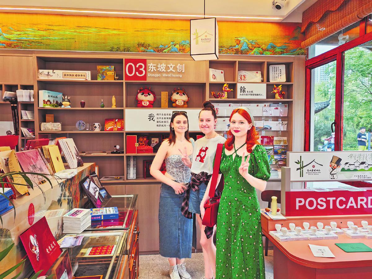 8月14日,“一帶一路”項目建設合作跨國圓桌會組委會原秘書長邢軍、部分外國友人和機構代表參觀訪問湖北省黃岡市黃州區,黃州東坡郵局被列為參觀重點之一。走進東坡郵局,考察團成員先后參觀了東坡紀念郵票展示區、東坡文化主題文創展示區、東坡詩詞圖書展示區、書寫集戳區、咖啡飲品區、直播帶貨區、婚慶禮品區。大家駐足欣賞墻面上東坡與黃州、東坡與中國、東坡與世界文化故事的詩詞書畫,興趣極濃地挑選、翻看各種精美的文創產品,詢問郵品開發情況,并相繼購買,還蓋上東坡郵局紀念郵戳。圖為漂亮的俄羅斯小姐姐在東坡文創區拍照打卡。