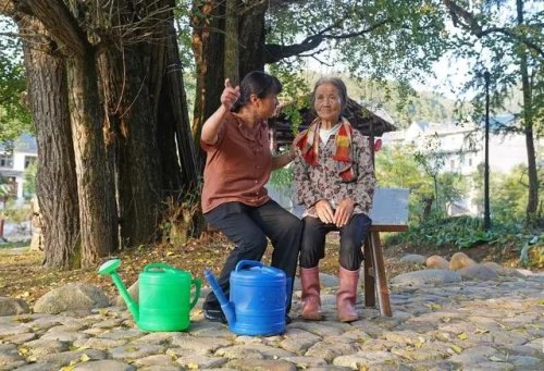 這是在江西省鉛山縣陳坊鄉(xiāng)沽溪村,羅細(xì)英(左)與一位相識(shí)的老人聊天(9月28日攝)。新華社記者 萬(wàn)象 攝