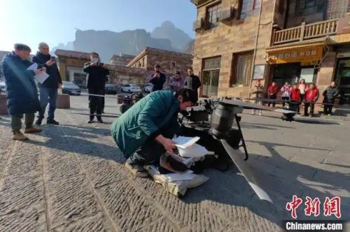 圖為無人機(jī)“郵遞員”降落在林州石板巖鎮(zhèn)中心廣場。 張俊軍 攝