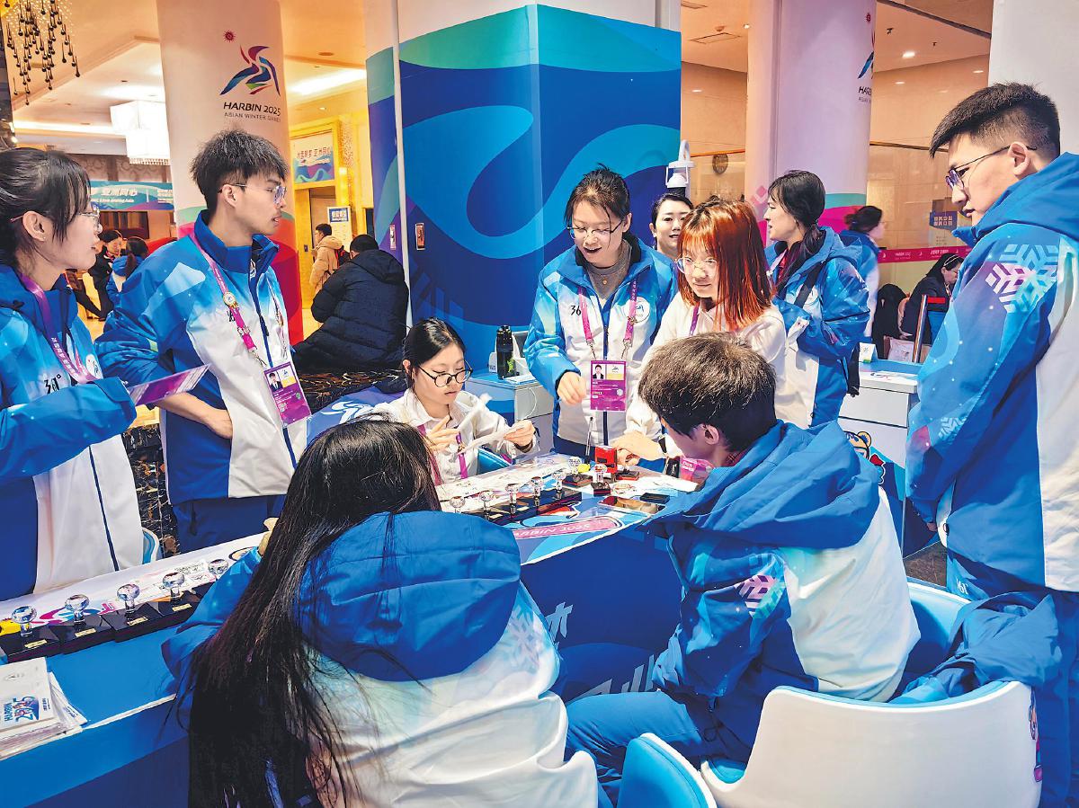 亞冬會志愿者在北大荒運動員村主題郵局打卡留念。□吳曉天 攝