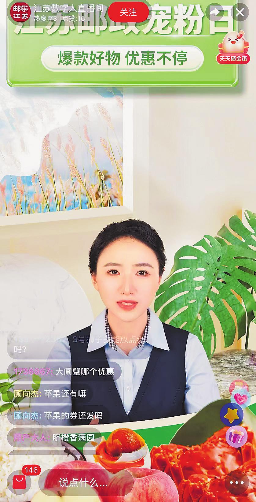 除了借助AI主播將郵政的多業務場景與鄉村振興相結合、實現AI智能7×24小時不間斷直播,江蘇郵政還組織實施省級科技創新項目,自主研發直播共享系統,搭建共享直播商品庫、知識庫與話術庫,持續整合視頻資源,提升直播觸達率。截至2024年底,全省郵政累計開展效能直播1578場,直播交易額達1.4億元,直播間觀看人數超1067萬人次。