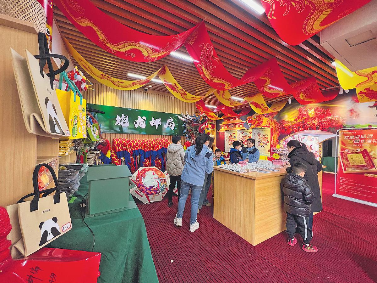 春節(jié)期間,游客在喜慶氛圍濃厚的炮龍郵局里打卡?!?/p>