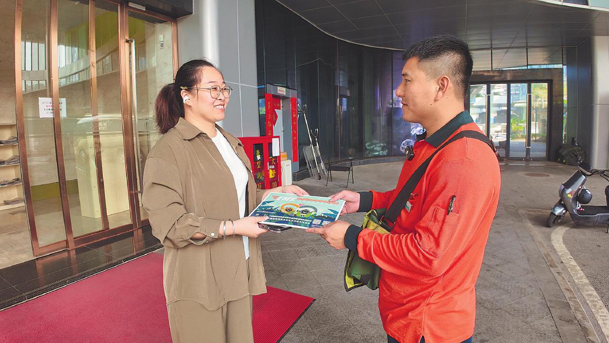 圖為投遞員將消博會證件郵件送交海口客戶馬女士。