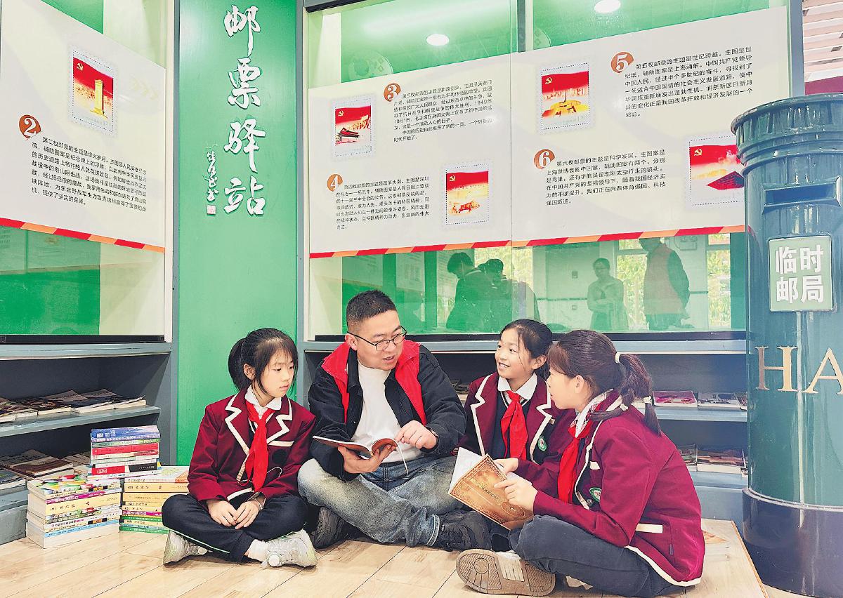 4月22日,江蘇省海安市郵政分公司走進城南實驗小學“郵票驛站”,開展全民閱讀圖書校園巡展活動。活動現(xiàn)場,同學們與郵政志愿者共讀集郵圖書,學習郵票知識。 □韋雅琴 攝影報道