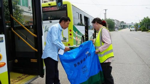 上午11時(shí)左右,車(chē)輛抵達(dá)潘塘街漢樓村。聽(tīng)到鳴笛聲,該村寄遞服務(wù)站負(fù)責(zé)人提前來(lái)到路邊等候,與公交司機(jī)交接了其中一袋屬于該村的快遞,一次投遞過(guò)程僅30秒。