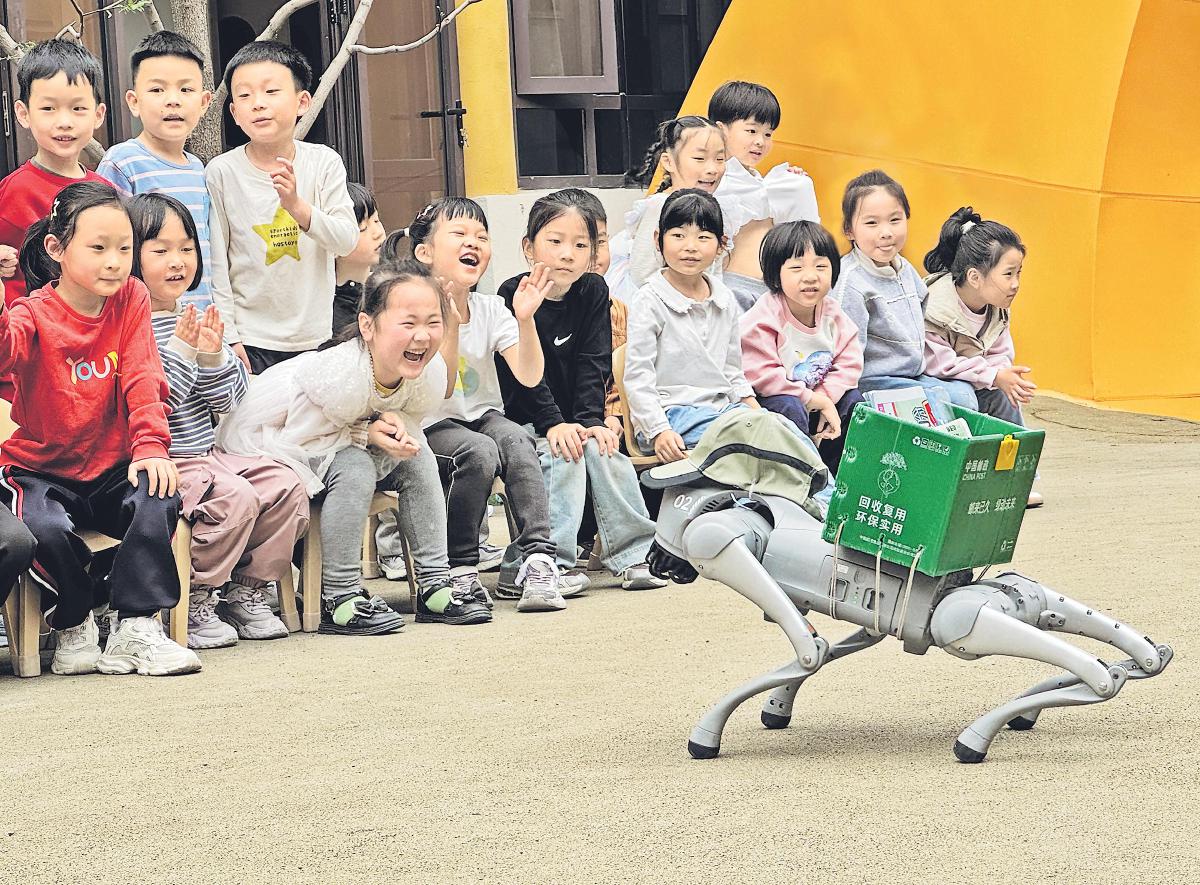 小朋友通過“小小郵遞員”“小小銀行家”等角色扮演,與機器狗互動,體驗送報、送信、送快遞,學(xué)習(xí)認識錢幣等知識。現(xiàn)場還設(shè)立了集郵文創(chuàng)產(chǎn)品、幼兒畫報圖書展示區(qū),吸引了眾多師生前來打卡。圖為“郵小驛”機器狗一出場就獲得小朋友喝彩。