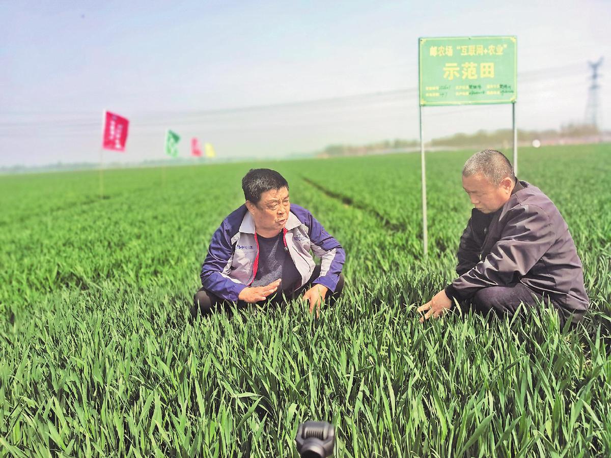“郵農(nóng)場”服務(wù)專員樊瑞河(左)在田間巡查,指導(dǎo)村民做好春小麥的管理。