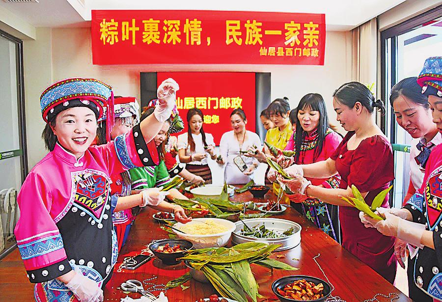 5月24日,浙江省仙居縣郵政分公司西門(mén)營(yíng)業(yè)所聯(lián)合仙居縣政協(xié)少數(shù)民族界別、工會(huì)界別,共同開(kāi)展“粽葉飄香迎端午 民族團(tuán)結(jié)一家親”主題活動(dòng)。活動(dòng)現(xiàn)場(chǎng),來(lái)自苗族、侗族、畬族等10個(gè)民族的30余名同胞身著民族盛裝,與郵政員工、政協(xié)委員們共聚一堂,包粽子、迎端午、話(huà)家常。