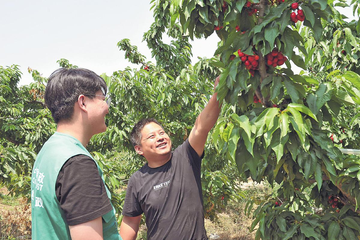 郵政員工幫助農(nóng)戶挑選櫻桃。