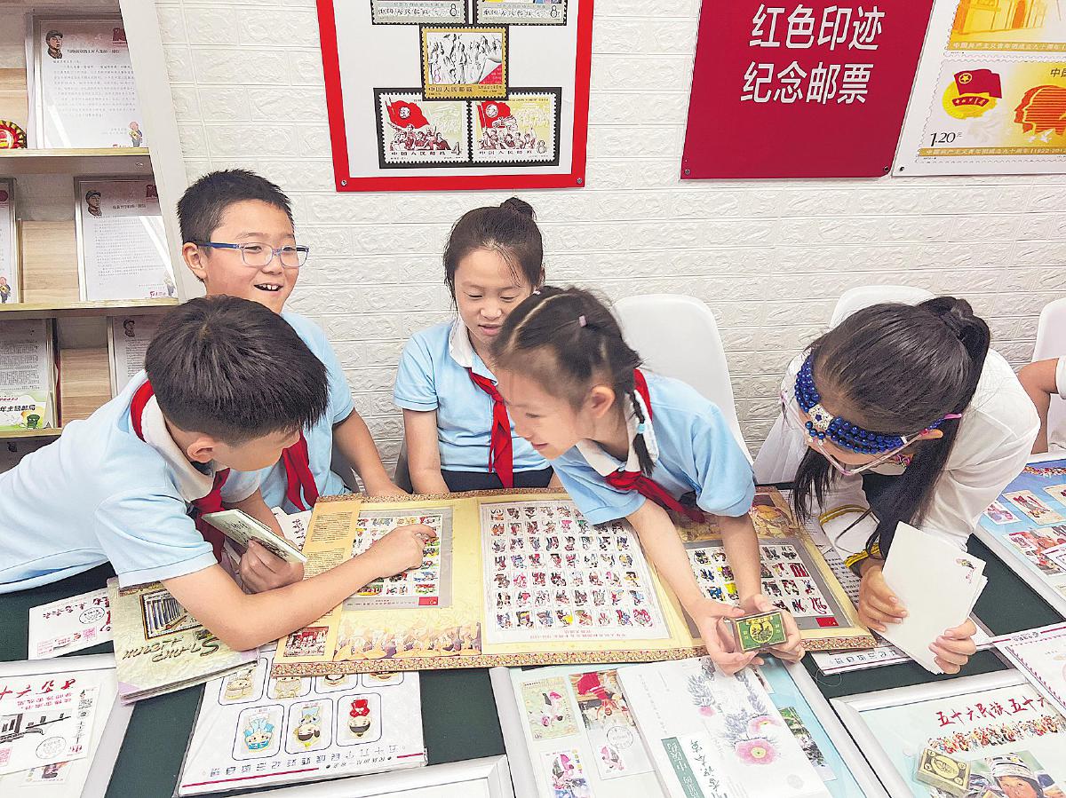 在主題郵局參加活動的小學(xué)生們一同欣賞著郵票。