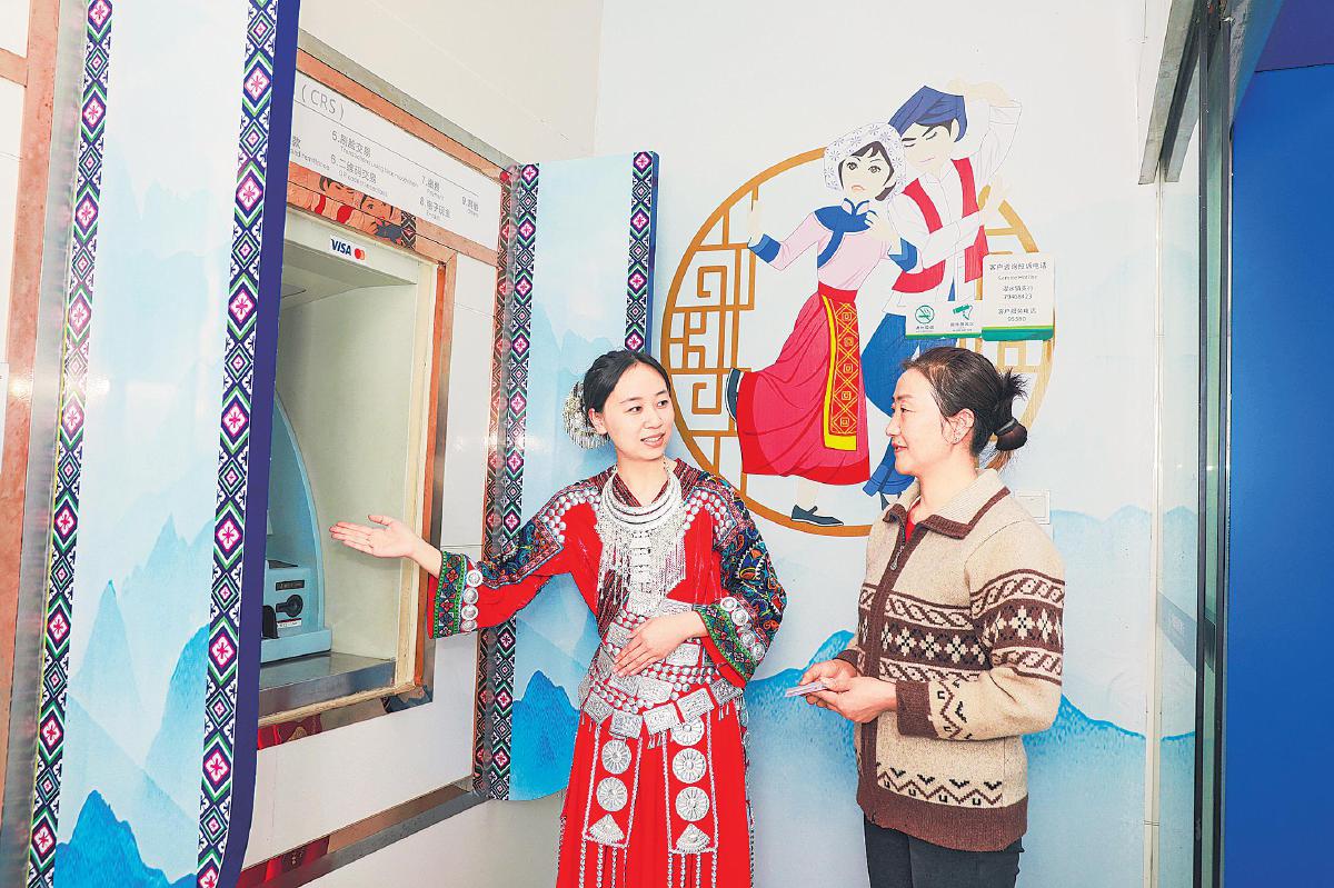 在青石板街的盡頭,陽光斜斜地灑在濯水鎮(zhèn)支行裝飾的“西蘭卡普”花紋上,赭紅與靛藍交織的花紋與遠處風(fēng)雨廊橋的飛檐翹角遙相呼應(yīng)。走進支行,濃郁的民族風(fēng)情撲面而來。“尼蒙好(您好)!”身著土家族傳統(tǒng)服飾的郵儲員工用方言向客戶問好。