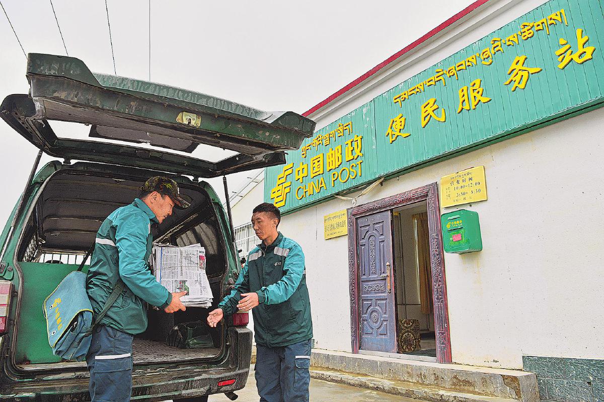 西藏郵政將黨報黨刊投送至全國海拔最高的鄉(xiāng)——普瑪江塘鄉(xiāng)。□藏由 攝