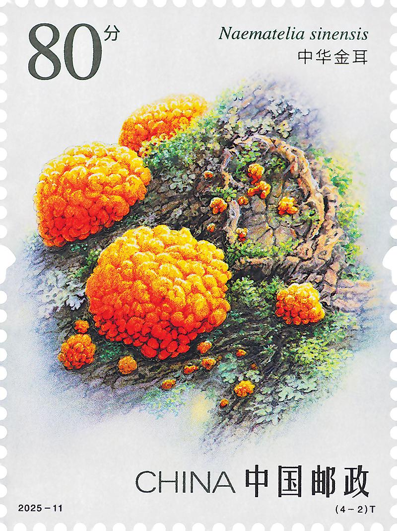 第一枚“變綠紅菇”,設(shè)計(jì)突出其青翠欲滴的色澤,并融入森林生態(tài)背景,使整體形象兼具自然野趣與美學(xué)韻味。第二枚“中華金耳”(如上圖),采用獨(dú)特的博物畫風(fēng)格精準(zhǔn)還原金耳獨(dú)特的皺紋與柔韌的果凍狀質(zhì)地。第三枚“松口蘑”,采用細(xì)致的筆法刻畫松口蘑菌蓋表面的細(xì)微紋理及菌柄的粗壯形態(tài),同時(shí)加入松林元素背景,以柔和的光影表現(xiàn)其生長環(huán)境,增強(qiáng)畫面的自然氛圍。第四枚“干巴菌”,以精細(xì)入微的線條勾勒干巴菌叢生分枝的復(fù)雜結(jié)構(gòu),輔以簡潔柔和的背景突出主體,再現(xiàn)了其鮮活之態(tài)。