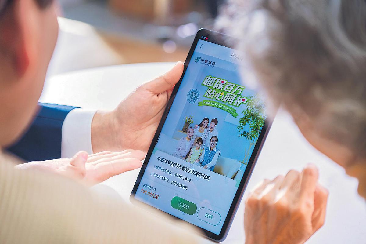 中郵保險(xiǎn)濟(jì)南市網(wǎng)點(diǎn)內(nèi),服務(wù)人員向客戶展示健康、養(yǎng)老保險(xiǎn)產(chǎn)品的可視化詳情,科技感中傳遞著專業(yè)與溫度。