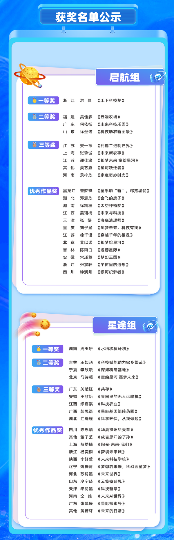 大賽開始以來,得到了社會(huì)各界的廣泛關(guān)注與參與,全國23個(gè)賽區(qū)共收到8.5萬幅參賽作品,從中推選出230幅優(yōu)秀作品參與全國總決賽的評比。經(jīng)過激烈的角逐和專家評委們的嚴(yán)格評審,評審出了“一等獎(jiǎng)”2件、“二等獎(jiǎng)”6件、“三等獎(jiǎng)”10件、“優(yōu)秀作品獎(jiǎng)”24件,共計(jì)42件獲獎(jiǎng)作品。來自全國各地的參賽小藝術(shù)家們手執(zhí)畫筆,在方寸郵票上精心描繪未來科技世界的奇妙圖景,充滿想象力的作品不僅獲得各位評審專家的高度贊譽(yù),更成為展現(xiàn)新時(shí)代少兒科學(xué)素養(yǎng)與創(chuàng)新活力的亮麗窗口。