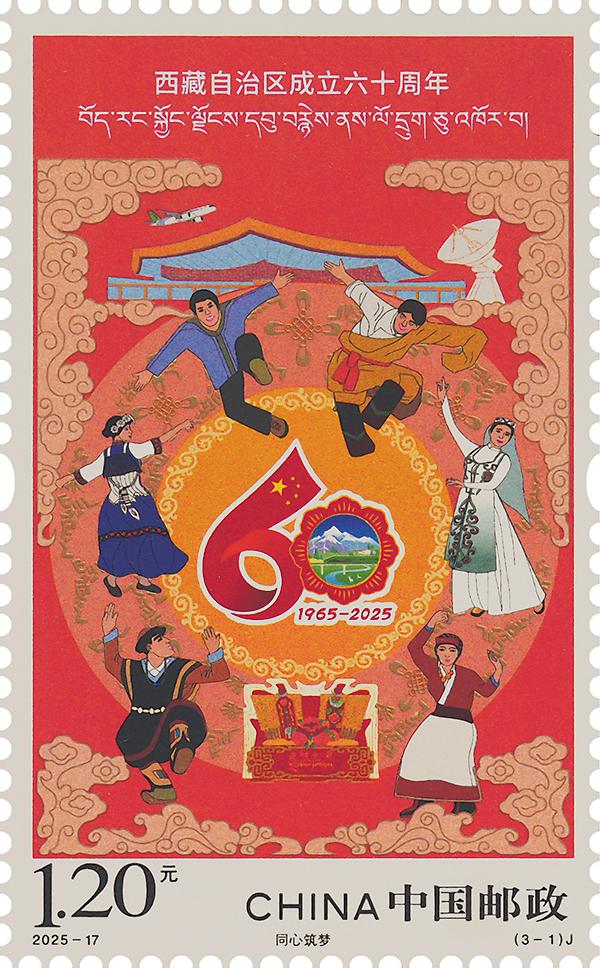 第一枚“同心筑夢(mèng)”,畫(huà)面以西藏自治區(qū)成立60周年慶?;顒?dòng)徽標(biāo)為主體,四周環(huán)繞身著盛裝歡慶的各族人民,背景展現(xiàn)了拉薩機(jī)場(chǎng)、C919飛機(jī)、日喀則40米射電望遠(yuǎn)鏡等元素,表現(xiàn)了西藏自治區(qū)成立60年來(lái),各族人民在黨的領(lǐng)導(dǎo)下攜手共進(jìn)、同心同行、民族團(tuán)結(jié)進(jìn)步的和諧畫(huà)面。