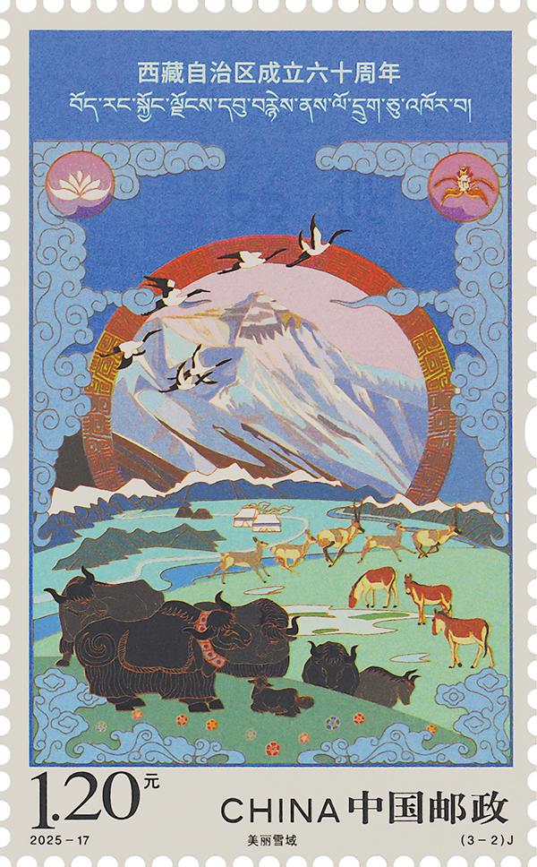 第二枚“美麗雪域”,描繪了漫步、奔跑的牦牛、藏野驢、藏羚羊,飛翔的黑頸鶴,以及陽(yáng)光映照下的珠穆朗瑪峰等元素,人與自然和諧相處的景象躍然紙上,展現(xiàn)了西藏獨(dú)特的生態(tài)環(huán)境和豐富的生物多樣性,體現(xiàn)出西藏在生態(tài)保護(hù)與生態(tài)文明建設(shè)方面取得的顯著成效。