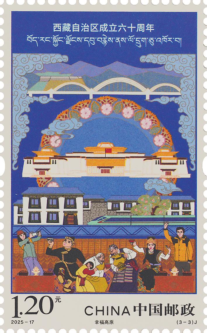 第三枚“幸福高原”,表現(xiàn)了西藏博物館、當(dāng)?shù)孛窬咏ㄖ?、拉林鐵路高鐵列車(chē)、拉薩河特大橋和旁多水庫(kù)等元素,安居樂(lè)業(yè)的人民和游客其樂(lè)融融,洋溢著幸福的笑容,展現(xiàn)出西藏的社會(huì)事業(yè)全面發(fā)展,民生福祉持續(xù)改善,群眾的獲得感、幸福感不斷增強(qiáng)的美好場(chǎng)景。