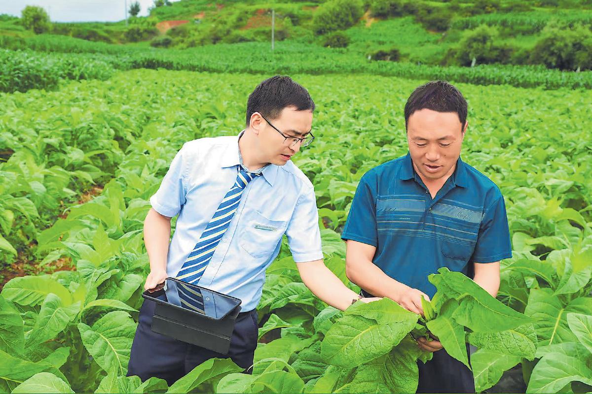 貴州省分行員工在煙田收集煙農(nóng)生產(chǎn)信息。