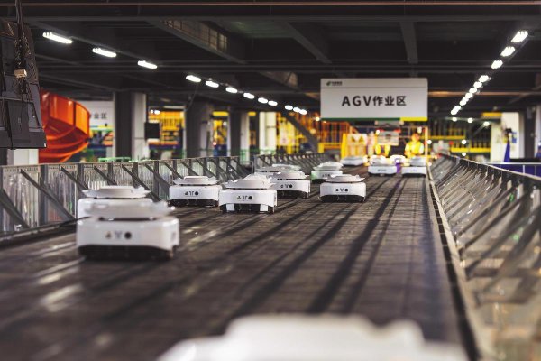 AGV智能分揀機(jī)器人在分揀快遞郵件。