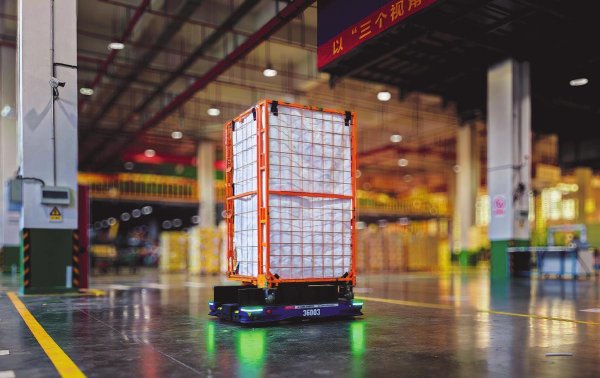 “馱背”式AGV正在運(yùn)輸郵件。