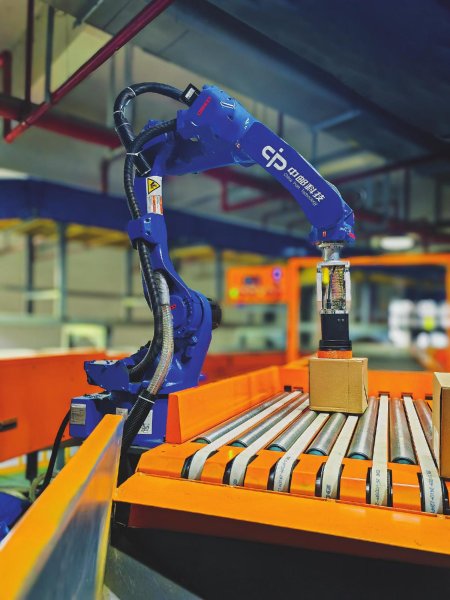 單臂供件機(jī)器人在抓取分揀快遞郵件。