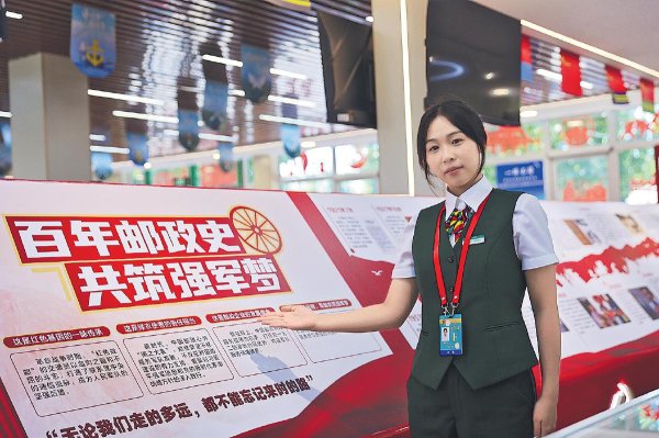 在“百年郵政史 共筑強(qiáng)軍夢”文化墻前,郵政工作人員為大家介紹用一枚枚郵票串聯(lián)起來的崢嶸歲月。