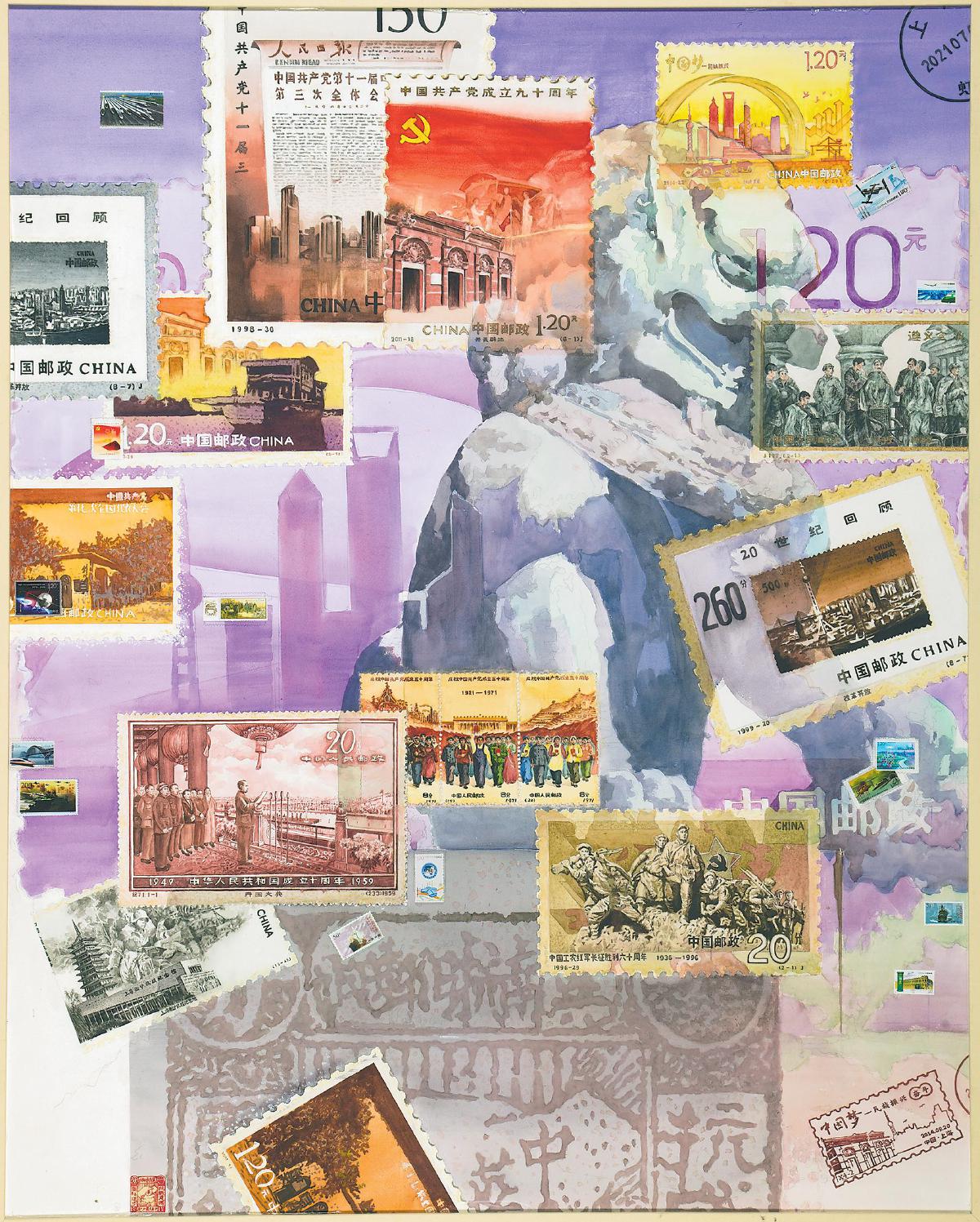 從郵票圖案的細(xì)節(jié)還原,到色彩色調(diào)的精準(zhǔn)把控,田燕萍始終追求用匠心打磨精品。她借鑒“蒙太奇”電影手法,用繪畫串聯(lián)起不同時(shí)代的郵票;背景特意繪制故宮石獅雕像,象征“蘇醒的雄獅”;底色選用紫色,取“紫氣東來”的吉祥寓意。每一處設(shè)計(jì)、每一筆勾勒,都藏著她對(duì)品質(zhì)的追求。