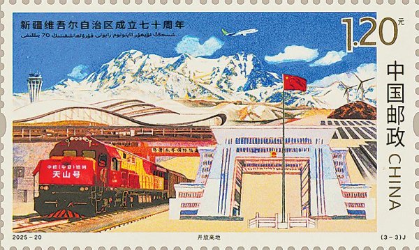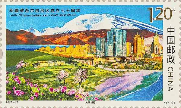 郵票圖案采用巖彩繪畫技法創(chuàng)作。第一枚“美麗新疆”,畫面主體為新疆城市美景,前景綻放的玫瑰代表塔克拉瑪干沙漠“鎖邊”工程,背景為昆侖山慕士塔格峰和卡拉庫(kù)里湖。第二枚“團(tuán)結(jié)和睦”,畫面表現(xiàn)了新疆各民族、各行業(yè)群眾團(tuán)結(jié)和諧、親如一家的場(chǎng)景。第三枚“開放高地”,畫面以中歐班列、霍爾果斯國(guó)門為主體,遠(yuǎn)景展現(xiàn)了烏魯木齊國(guó)際機(jī)場(chǎng)、光伏電站和博格達(dá)峰。郵票充分展現(xiàn)了在新疆這片美麗、廣袤的土地上,傳統(tǒng)與現(xiàn)代交織,自然與人文共生,古老與青春共舞;生動(dòng)描繪了各族群眾獲得感、幸福感、安全感不斷增強(qiáng)的美好圖景,各族群眾像石榴籽一樣緊緊抱在一起,在中國(guó)式現(xiàn)代化進(jìn)程中更好建設(shè)團(tuán)結(jié)和諧、繁榮富裕、文明進(jìn)步、安居樂業(yè)、生態(tài)良好的美麗新疆。