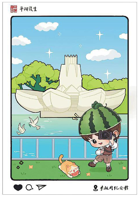 在項(xiàng)目推進(jìn)過(guò)程中,設(shè)計(jì)團(tuán)隊(duì)與平湖市委宣傳部進(jìn)行了多輪溝通,最終獲得政府層面的認(rèn)可與支持。設(shè)計(jì)構(gòu)思上,團(tuán)隊(duì)深入挖掘平湖地方文化資源,注重將城市肌理與精神符號(hào)融入方寸之間。彩戳及手繪明信片的圖案不僅選取了當(dāng)?shù)卮硇跃坝^(guān),更著重突出了與一代文化巨擘李叔同相關(guān)的元素,如作為城市文化新地標(biāo)的東湖李叔同紀(jì)念館。該紀(jì)念館于今年5月完成升級(jí)并重新開(kāi)放,成為集中展示李叔同生平與藝術(shù)成就的重要窗口,也為彩戳、手繪明信片設(shè)計(jì)提供了豐富的視覺(jué)素材和內(nèi)涵支撐。手繪明信片還融入了卡通人物形象,貓咪與戴西瓜帽的動(dòng)漫人物形象活潑俏皮,細(xì)節(jié)處滿(mǎn)是巧思。